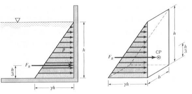 측면에 작용하는 힘의 해석으로 도식적 방법을 사용한다. 압력은 깊이에 따라 선형적으로 비례하므로 그림과 같이 압력분포를 나타낼 수 있으므로 면 bh에 작용하는 합력은