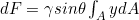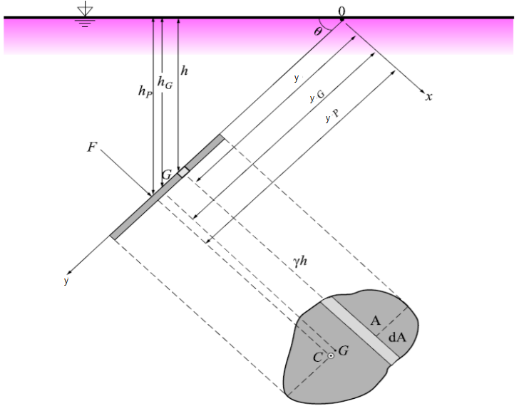 그림에 있는 경사면의 미소면적 dA에 작용하는 힘은 dF=γhdA이고 수직으로 작용한다.