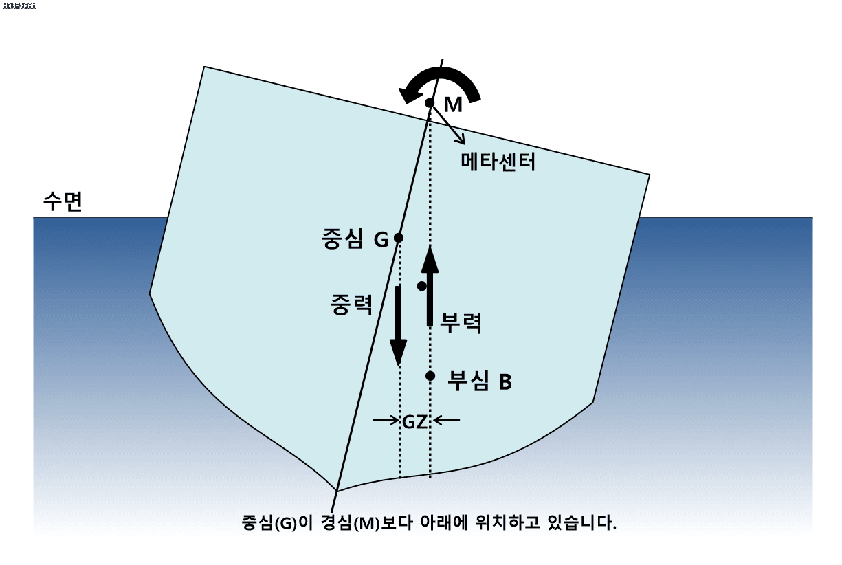 간단하게 설명하면 무게중심이 부력중심보다 아래에 위치하엿을때 전복될시 복원 모멘트가 발생하여 안정성이 높아지고,