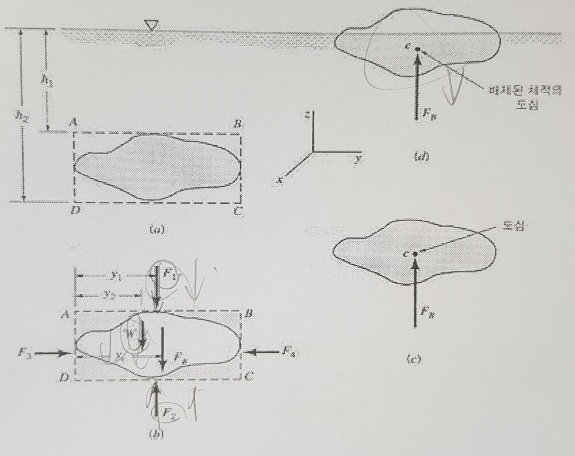 배제된 체적의 도심을 지난다. 이 점을 부력중심이라고 한다.