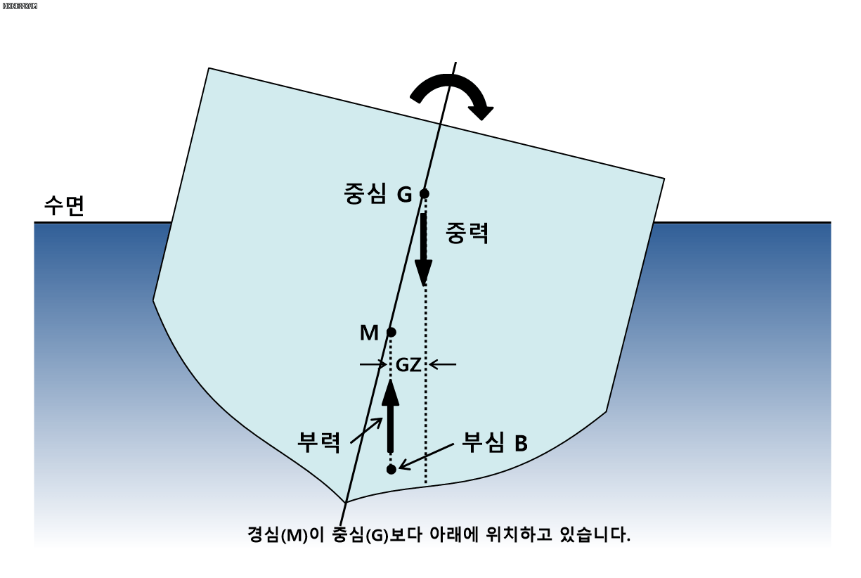 무게중심이 부력중심보다 위에 위치하였을 때엔 전복될시 전복모멘드가 발생하여 전복이 가속된다.
