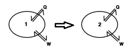 위 그림은 닫힌계에서 1번상태에서 2번상태로 변화하는 과정을 보고 있다. 1번에서 2번으로 변화하면서 계가 갖고 있는 Q의 양이 변화하였고, W의 변화량 역시 존재한다. 이 변화를 식으로 표현하면
