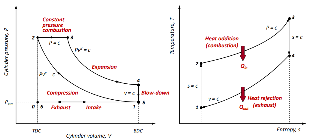 4행정 저속 CI(디젤) 엔진 공기 표준 열역학적 이상 사이클이다.