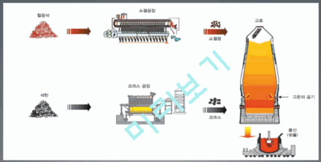 기존 코렉스(용광로) 공법에서는 소결공정과 코크스 공정을 얻기위한